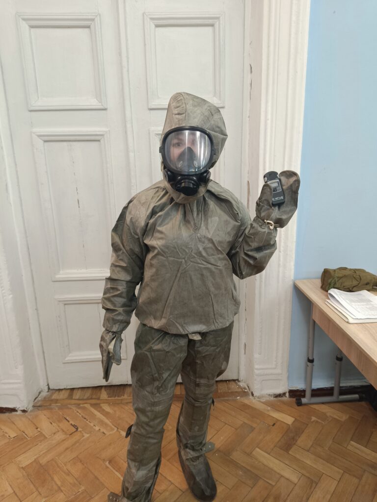 Практична частина включала одягання засобів індивідуального захисту — протигазів та захисних костюмів — і роботу з приладами радіаційного контролю. Учасники навчалися визначати рівень радіації та правильно діяти в умовах можливого ураження.
